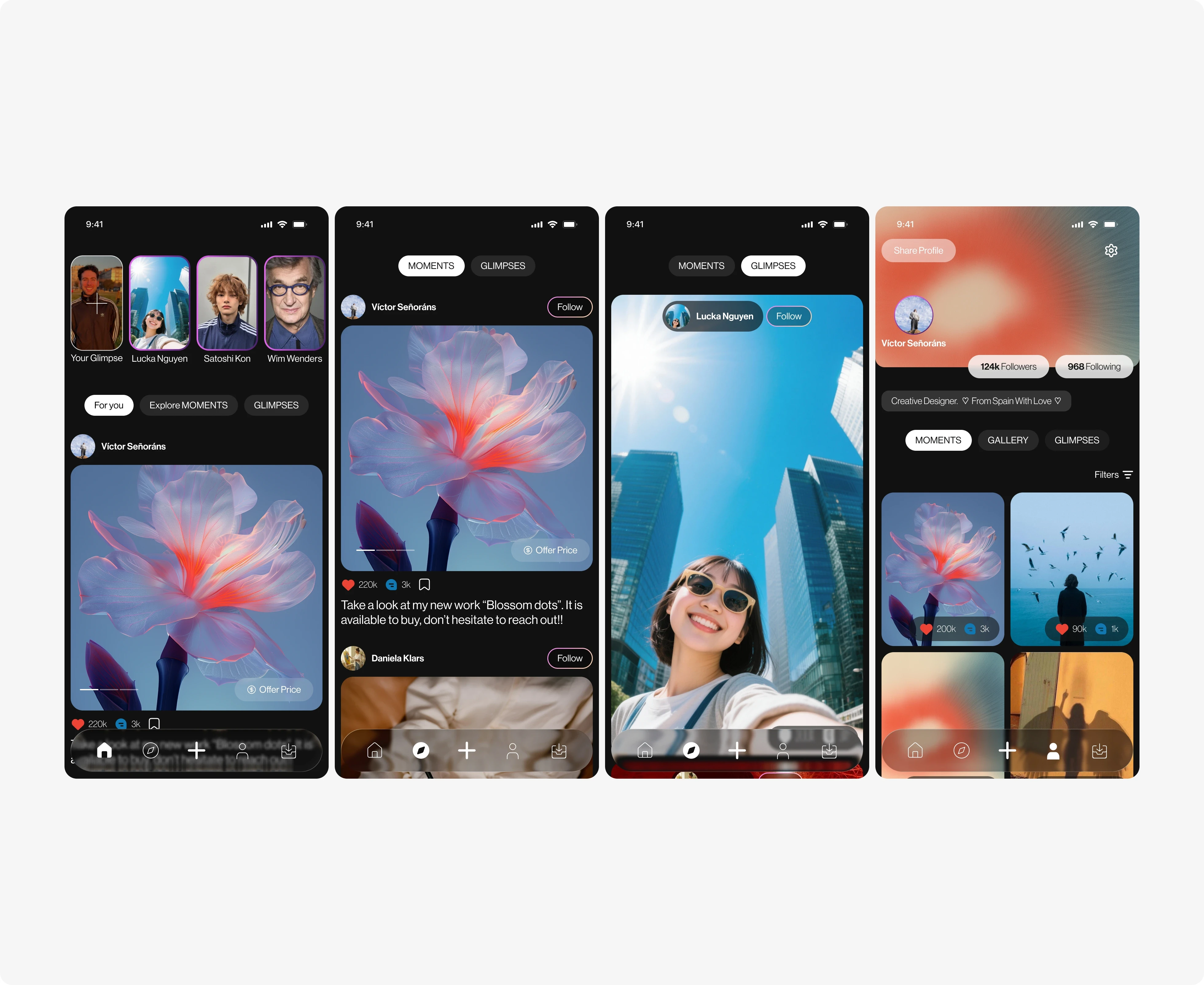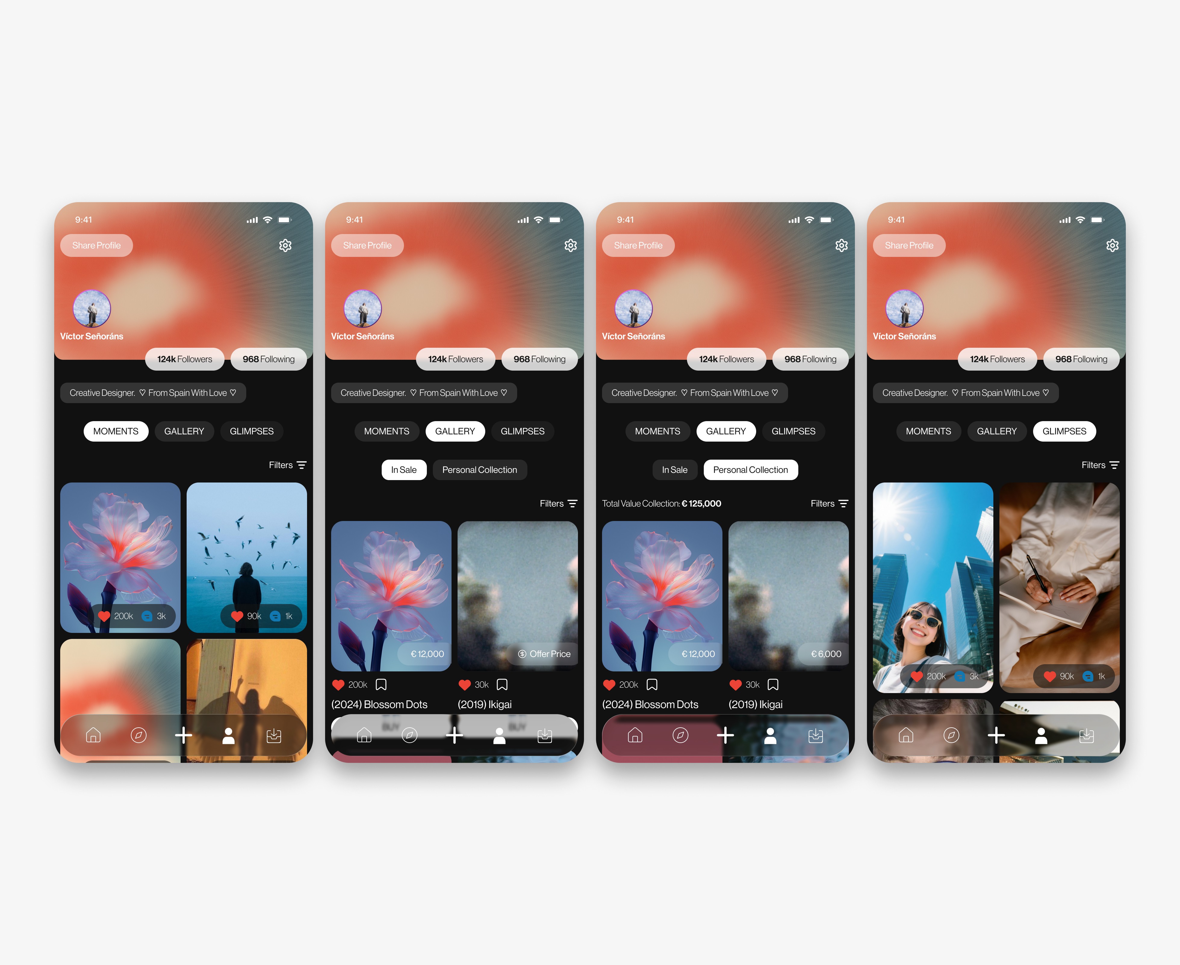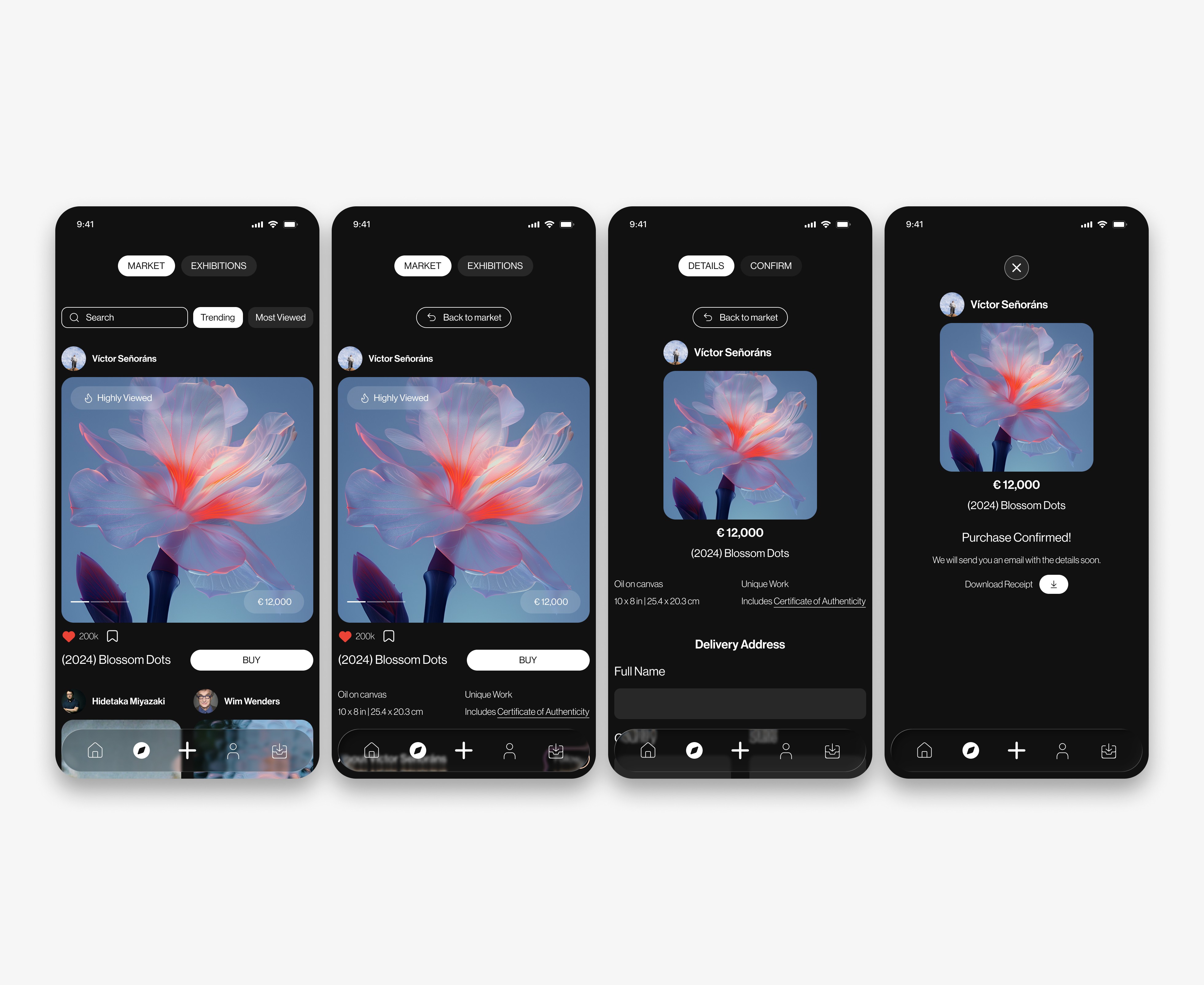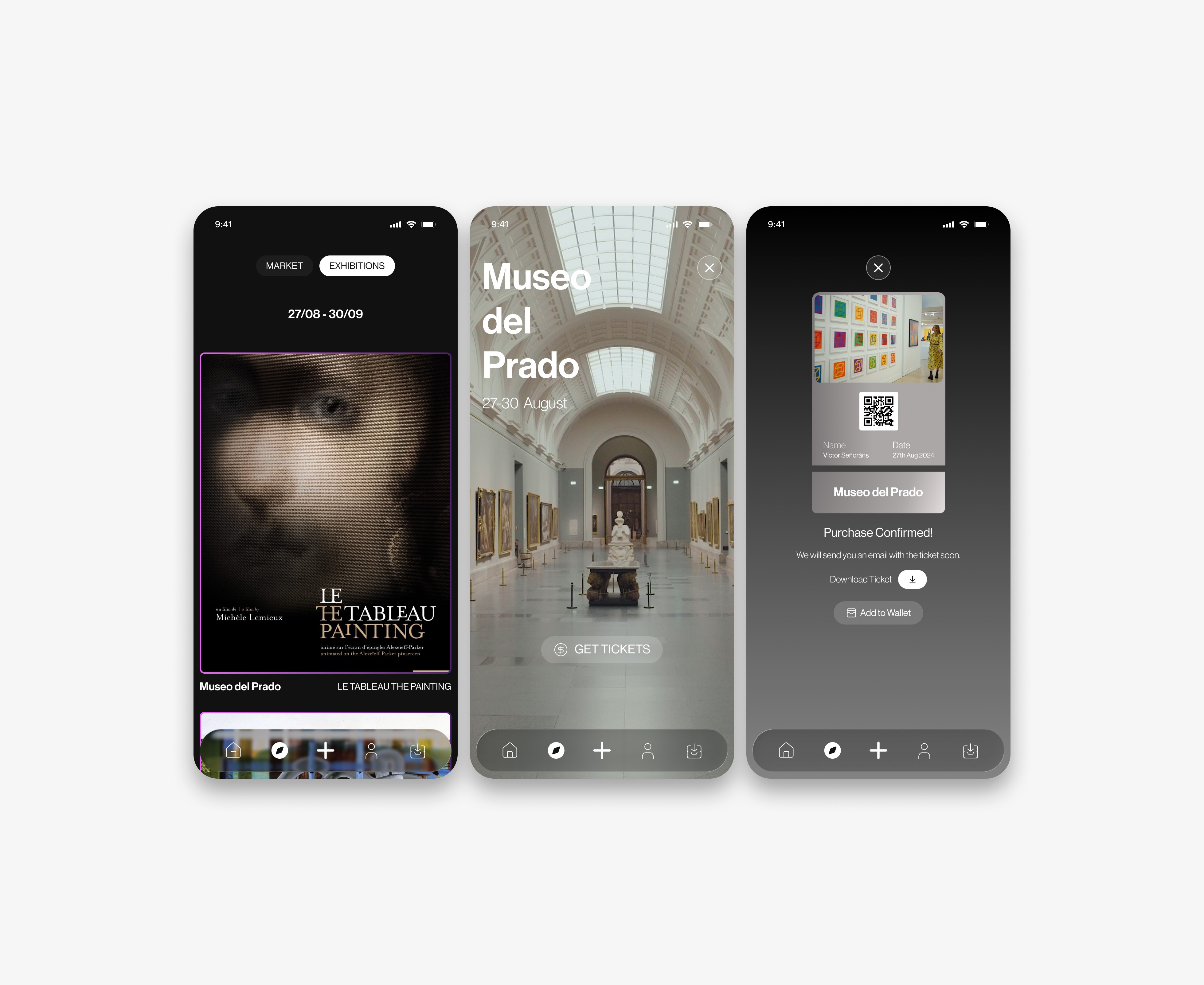 To organize this large number of functionalities, I designed a context-based information architecture in Figma. Smart Feeds: I visually differentiated entertainment content (Reels/Stories) from commercial content. While the social feed prioritizes full-screen immersion, the Marketplace uses structured grids to facilitate price and detail comparison. Experience Wallet: I integrated the ticketing system (museum tickets) into a unified user profile, using quick-access QR codes and visual reminders. Purchase Micro-interactions: I designed a "2-click purchase" flow integrated directly into social posts, allowing users to acquire a work of art without leaving the discovery experience.